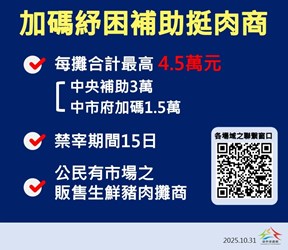 因應非洲豬瘟疫情防控政策,農業部自今年10月22日公告實施「禁運禁宰」措施,全國豬隻運輸及屠宰作業暫停,生鮮豬肉供應中斷,攤商營運受創。台中市政府宣布,除免收公有市場未出攤使用費外,今(31)日再擴大加碼,補助每攤1.5萬元,配合行政院10月30日公布的每攤3萬元補助,台中市生鮮豬肉攤商合計最高可領4.5萬元,展現市府力挺基層、攜手度過難關的決心。