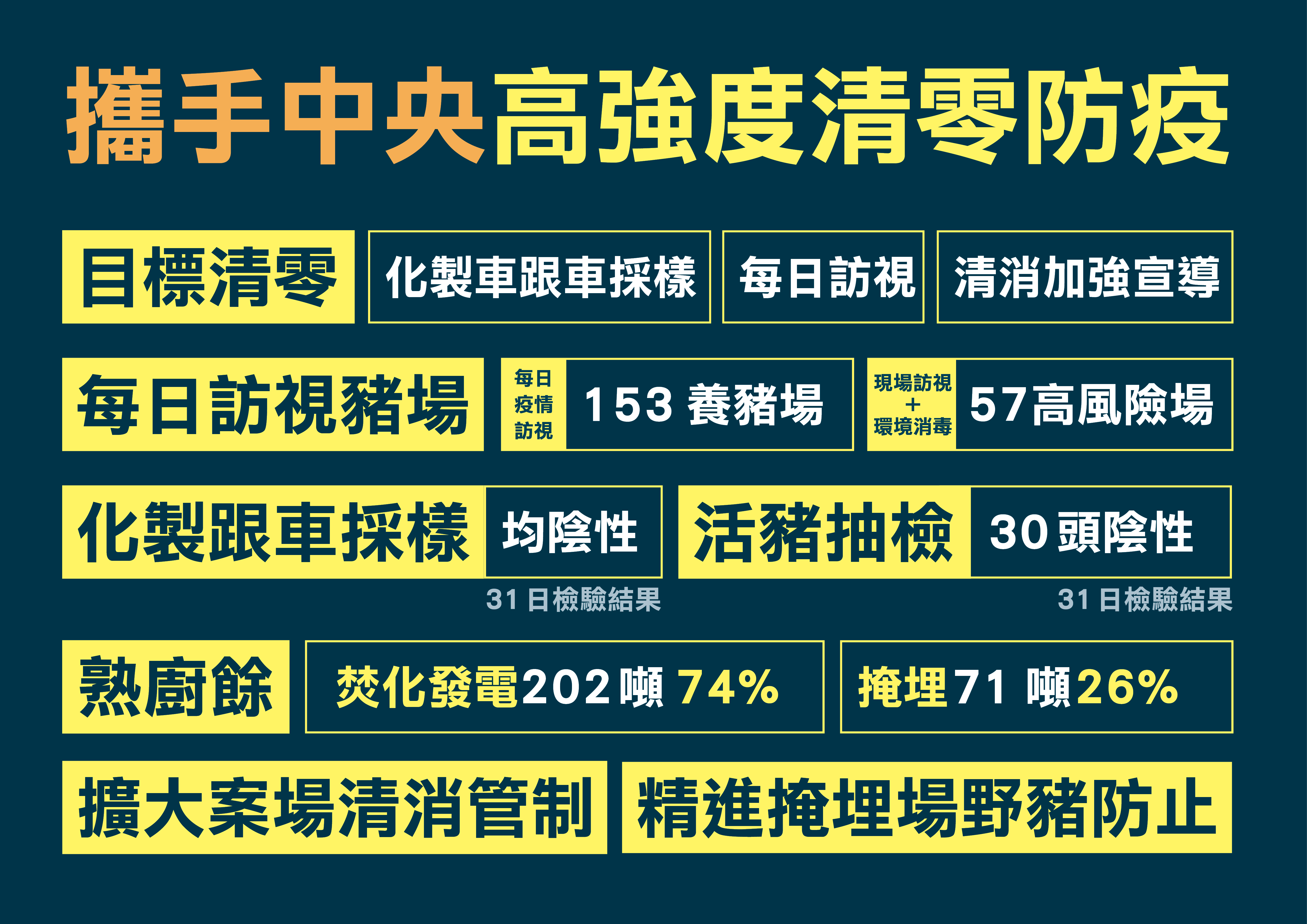 副市長鄭照新表示,疫情進入最後階段,中央與地方正全力合作,採取最高強度的「清零防疫」措施。第三階段起,市府每日持續訪視全市153處豬場,高風險場也由原本55場增加至57場,顯示防疫標準全面加嚴。新增的高風險場包括為提高防疫標準,將追蹤時間軸自9月往前推到8月15日,因此增加1個高風險場;另一處是太平區圈養6頭山豬的豬場,市府已納入嚴格管理。鄭副市長感謝市民積極通報,並指出截至10月31日,化製車跟車採樣、活豬抽檢及廚餘檢驗結果皆為陰性,顯示防疫成效穩定。