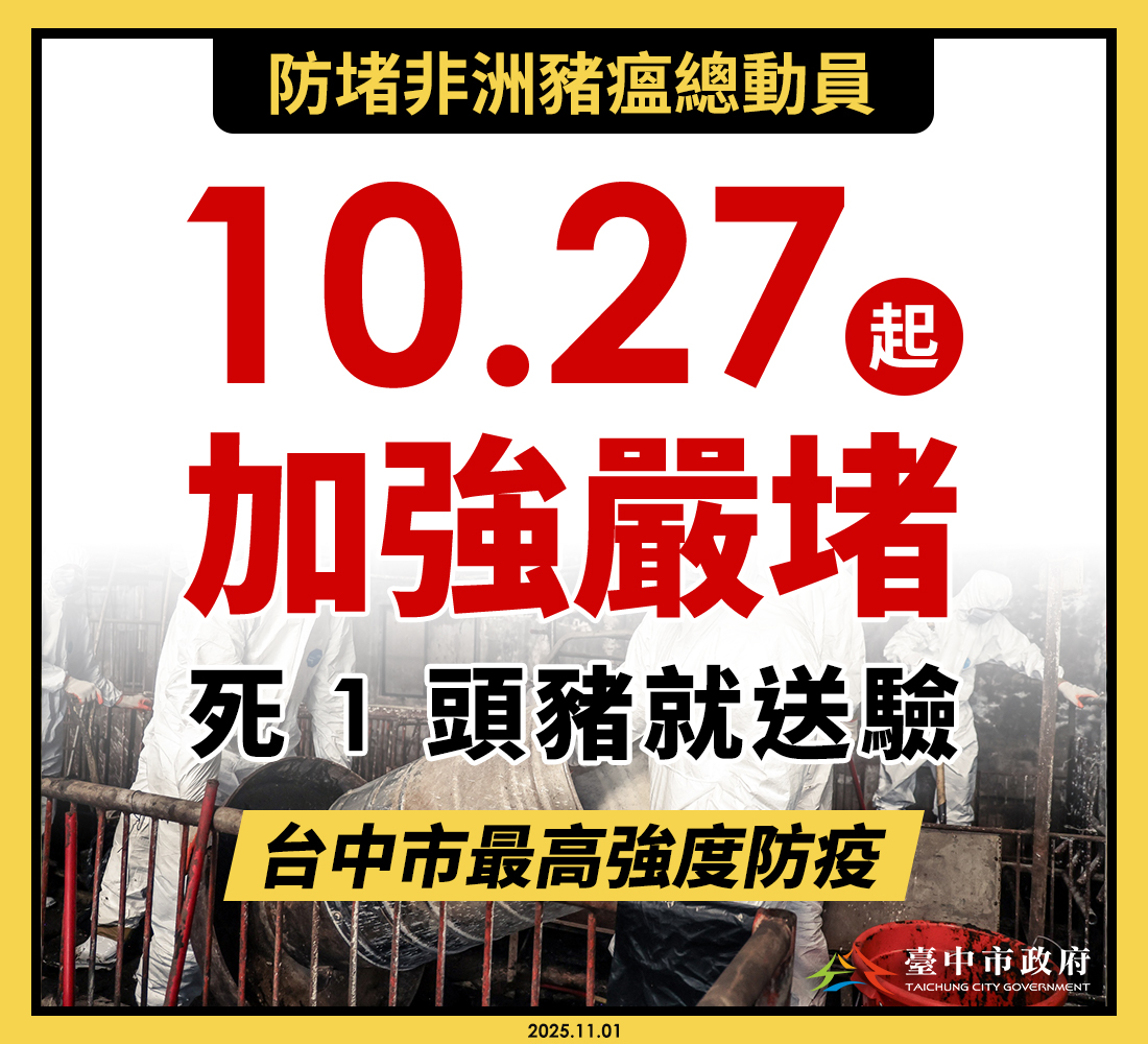 農業局表示,動保處結合各區公所防疫人員,全力加強養豬場訪查與採檢,嚴防疫情入侵。截至11月1日止,已完成152場健康訪查,10月31日採樣26場共62頭檢驗均為陰性,顯示市內豬隻健康、畜牧生產穩定。針對梧棲案例場,經專家建議於不擾動環境下進行防治,明日將再採樣確認,並以鹼片消毒、加裝黑網圍籬防止鼠犬入侵。警方同步強化巡邏管制,禁止無關人員進入。農業局每日掌握全市斃死豬數量,今日15場26頭均完成化製處理,有效防堵病原擴散,將持續與中央合作,守護畜牧安全與民眾食安。