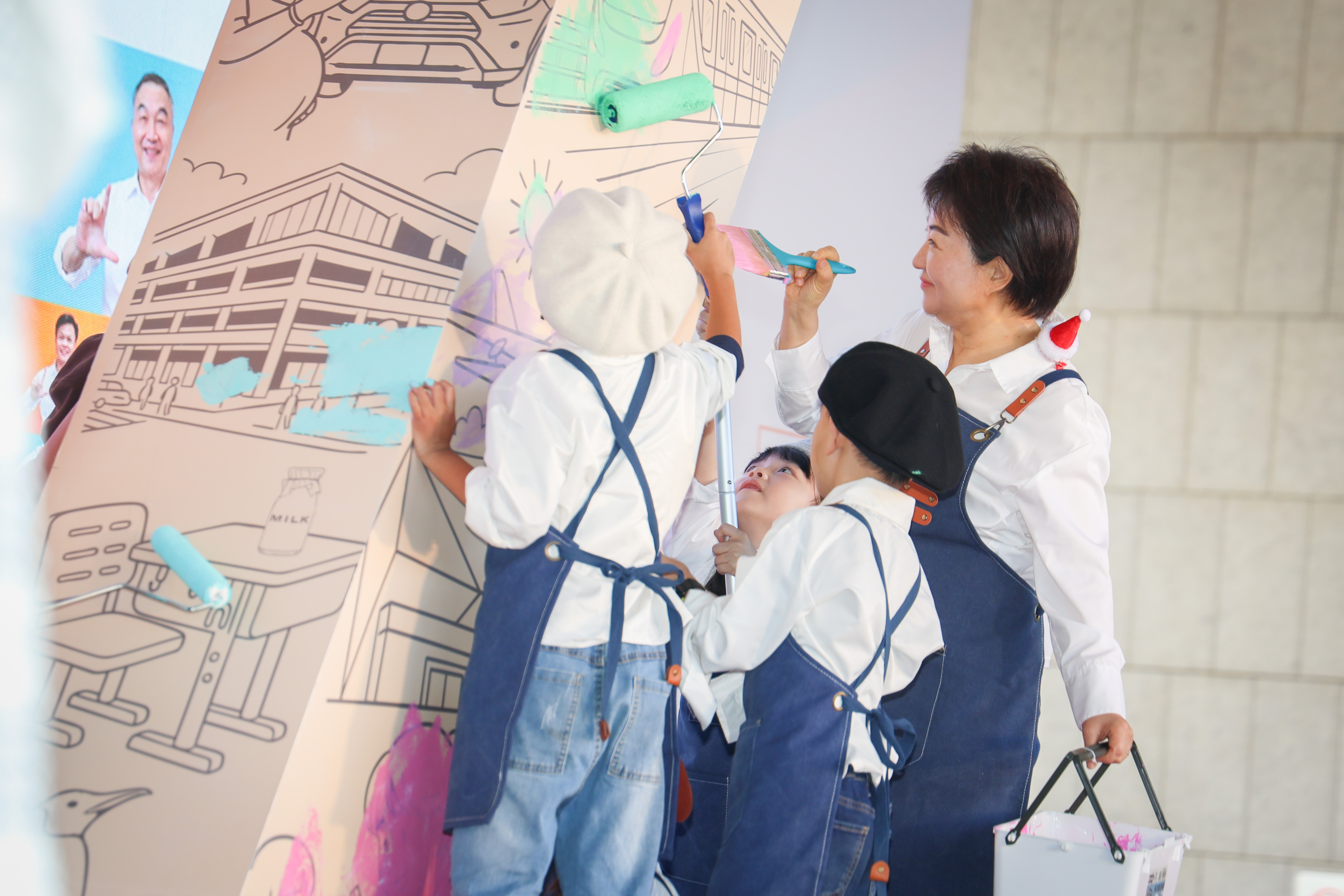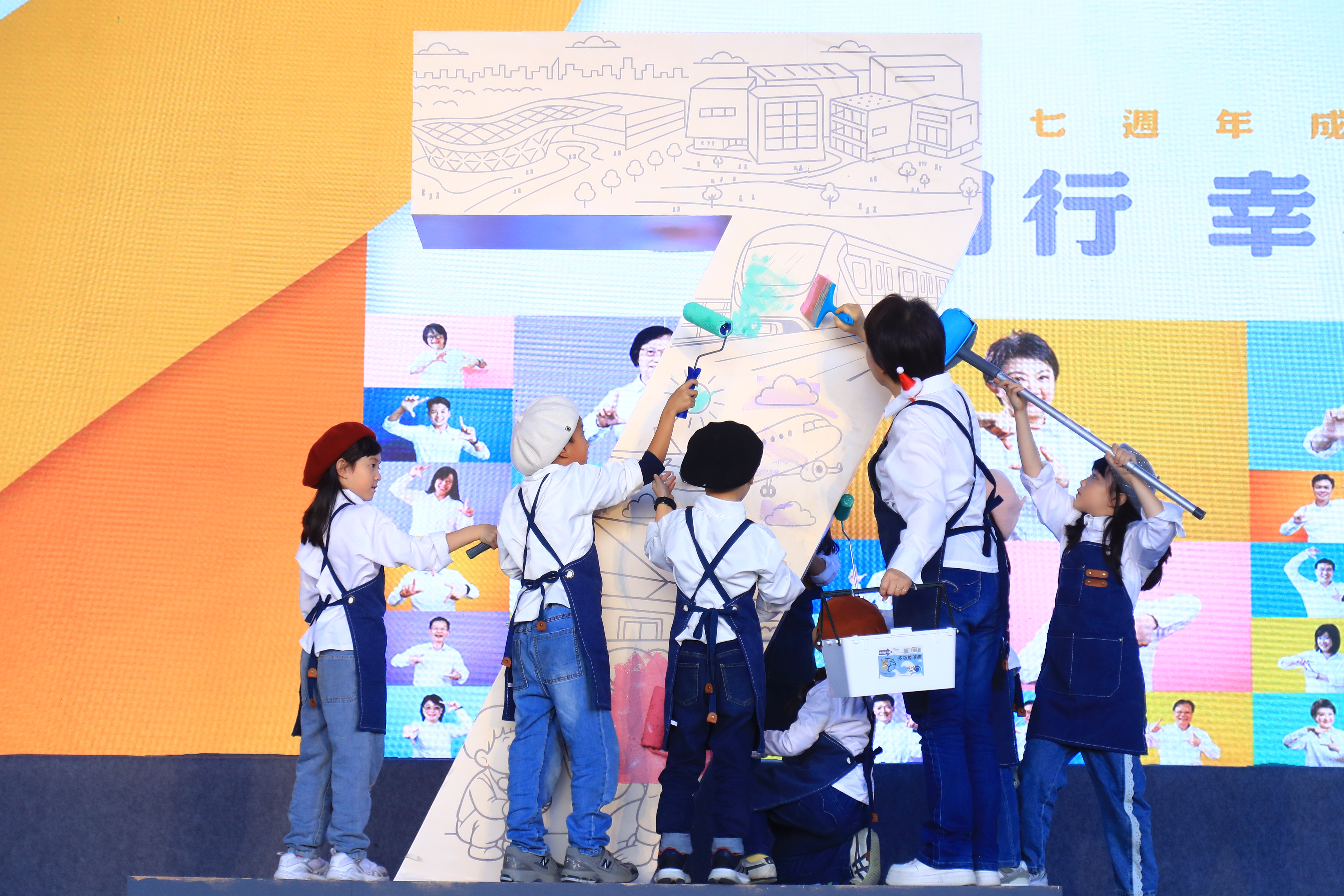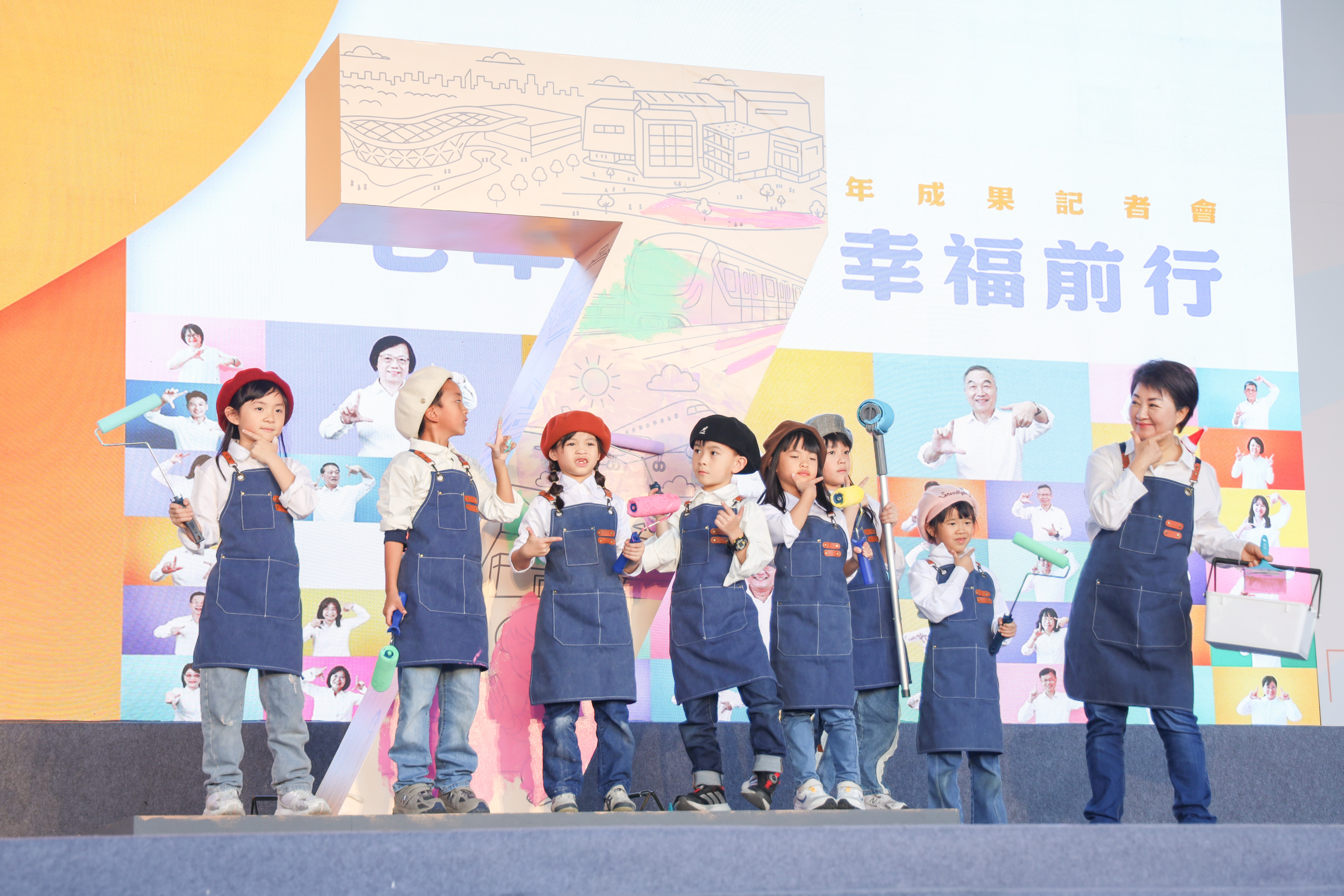 今日記者會特別邀請7位與盧市長2018年上任同一年出生的孩子擔任嘉賓,盧市長與孩子High5並開心說,「他們7歲,我上任七年!」,孩子與市長一同彩繪台中7年來代表性建設的藝術裝置,象徵「為城市上色」,陪孩子見證台中7年來的成長與變化。