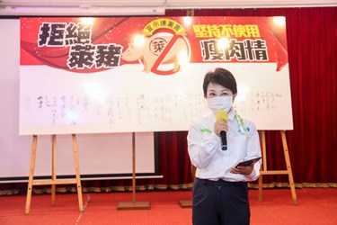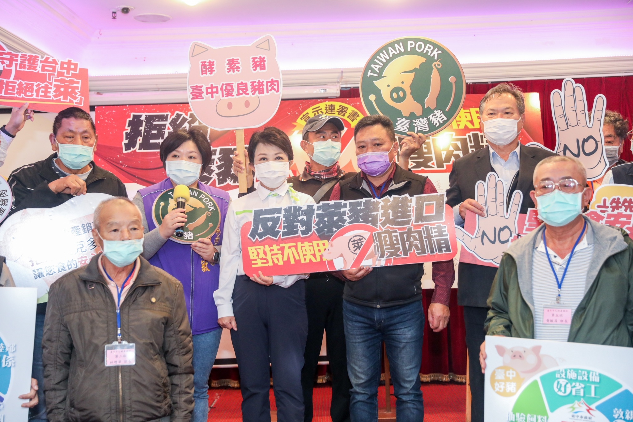 中央即將開放美國含萊克多巴胺豬肉進口,台中市政府今(17)日舉辦「養豬振興宣誓連署拒萊豬」座談會,邀請台中市養豬協會與毛豬產銷班班員,簽名連署宣誓「拒絕萊豬、堅持不使用瘦肉精」,除表達台中豬農高標準自我要求,更向中央表達台中反對含瘦肉精豬肉進口政策,鼓勵市民品嘗在地好吃、健康又實在的畜產品。市長盧秀燕出席共同簽署、力挺國產豬,展現市府拒絕萊豬的決心。