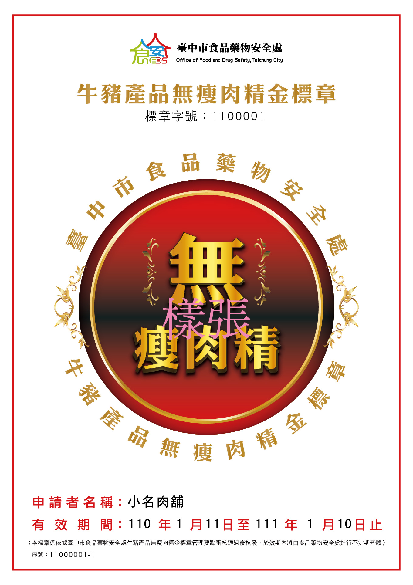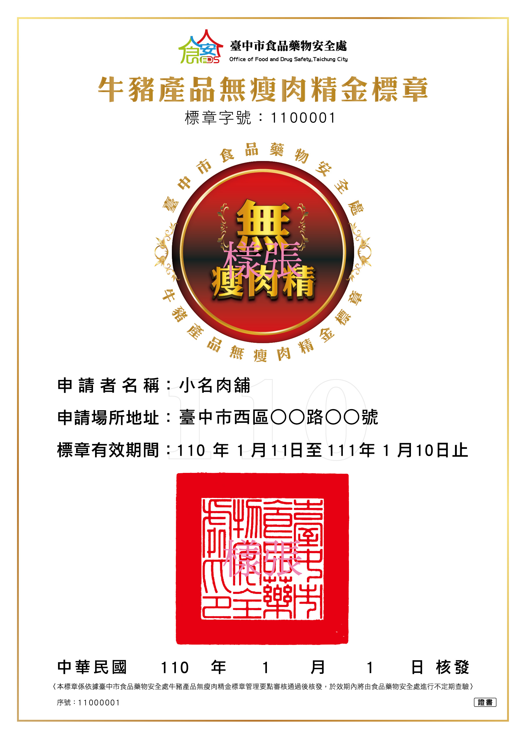 台中市食品藥物安全處長傅瓊慧說明,金標章申請對象為台中市具食品業者登錄字號、稅籍登記、商業登記或領有立案登記證明文件者,且於台中市販售或使用國產牛肉、豬肉及其加工製品者;業者可使用網路或紙本向市府申請,檢附食品業者登錄字號、稅籍登記及11日之後3個月內肉品未驗出瘦肉精的檢驗報告或牛豬肉來源產地相關證明文件,並檢附「牛、豬肉品來源供貨商」清冊,經書面及實地審核通過後才能核發標章。