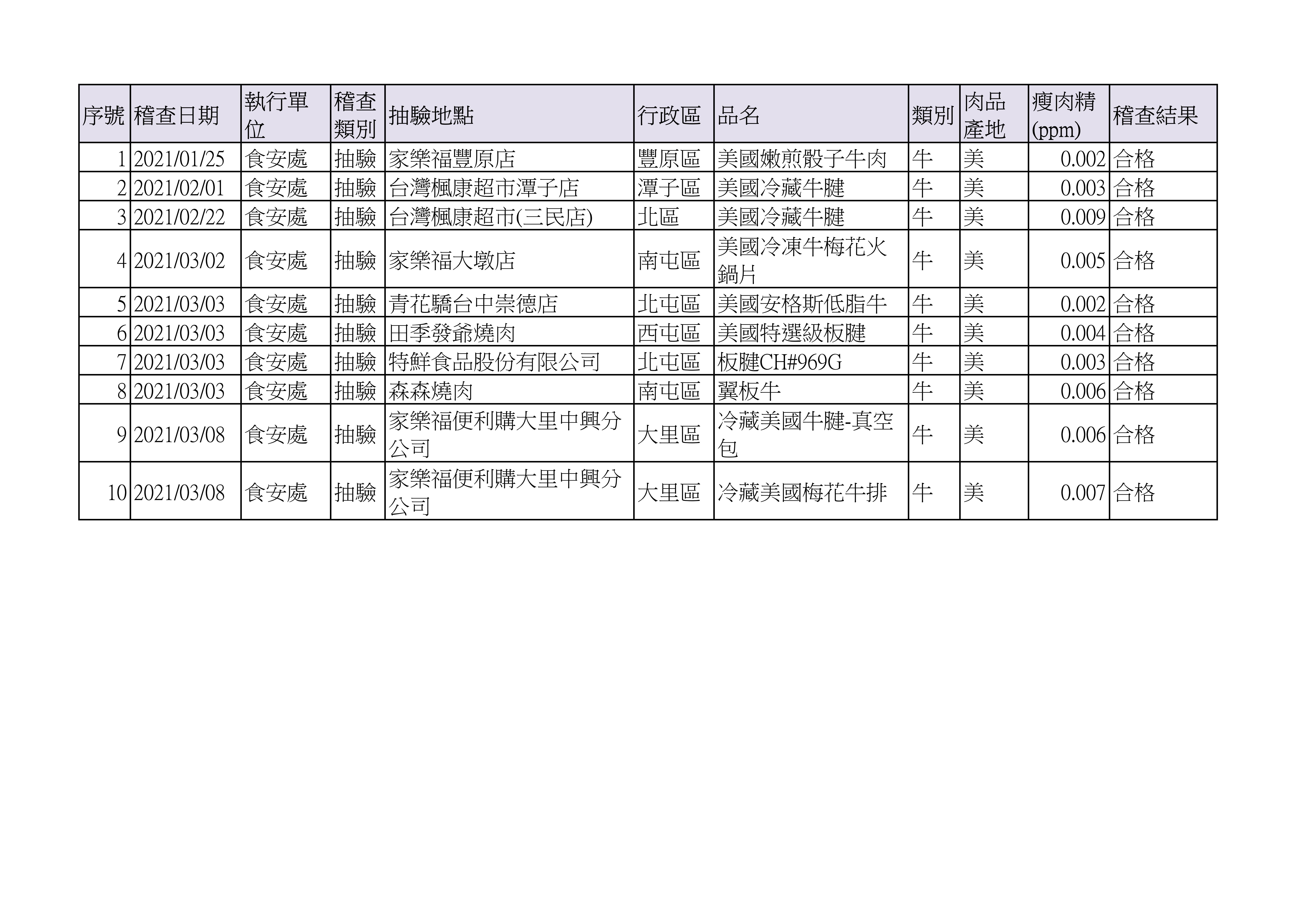 中央今年元旦起開放萊豬進口,引發民眾關切,台中市政府衛生局持續加強查驗量能,除於日前查獲一件美國冷藏牛腱檢出萊克多巴胺超標,依法開罰12萬元,今(30)日再於萊豬牛宣導專區公布10件檢出微量萊克多巴胺的進口牛肉資訊。衛生局表示,雖檢出微量數值,但仍於法規標準內,相關訊息均揭露於專區,開放民眾查詢。