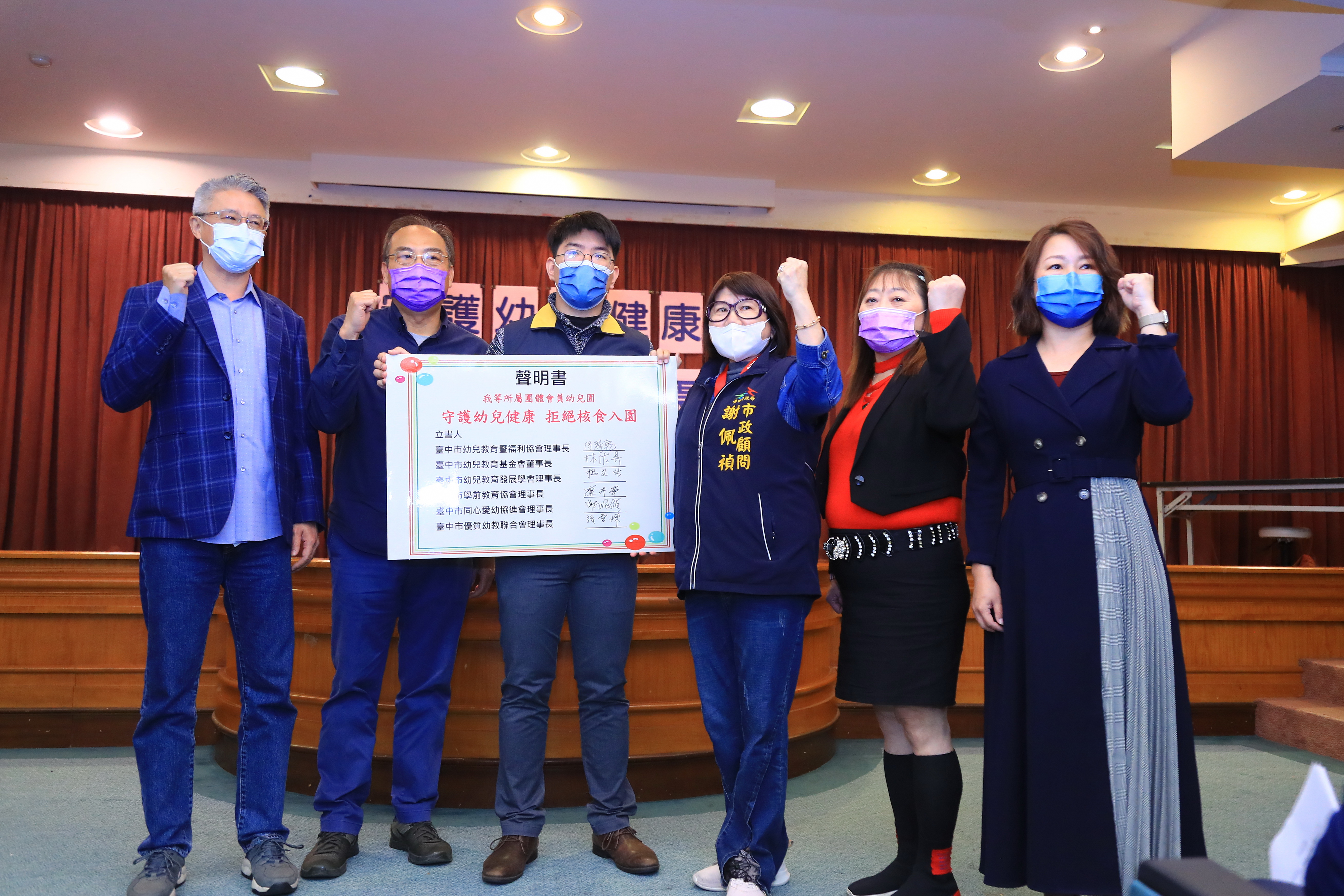 今日台中市六大幼教團體,包括台中市幼兒教育暨福利協會理事長何瑞乾、財團法人台中市幼兒教育基金會董事林佐昇、台中市幼兒教育發展學會理事長楊文佑、台中市學前教育協會理事長蔡沛華、台中市同心愛幼協進會理事長謝佩禎及台中市優質幼教聯合會理事長張愛珠均到場簽署聲明,表達反核食入園的立場。盧市長與教育局長楊振昇受邀出席,台中市幼兒教育暨福利協會創會理事長王超敏、市議員陳政顯服務處代表等人也到場關心。(2/16*7)*教育局