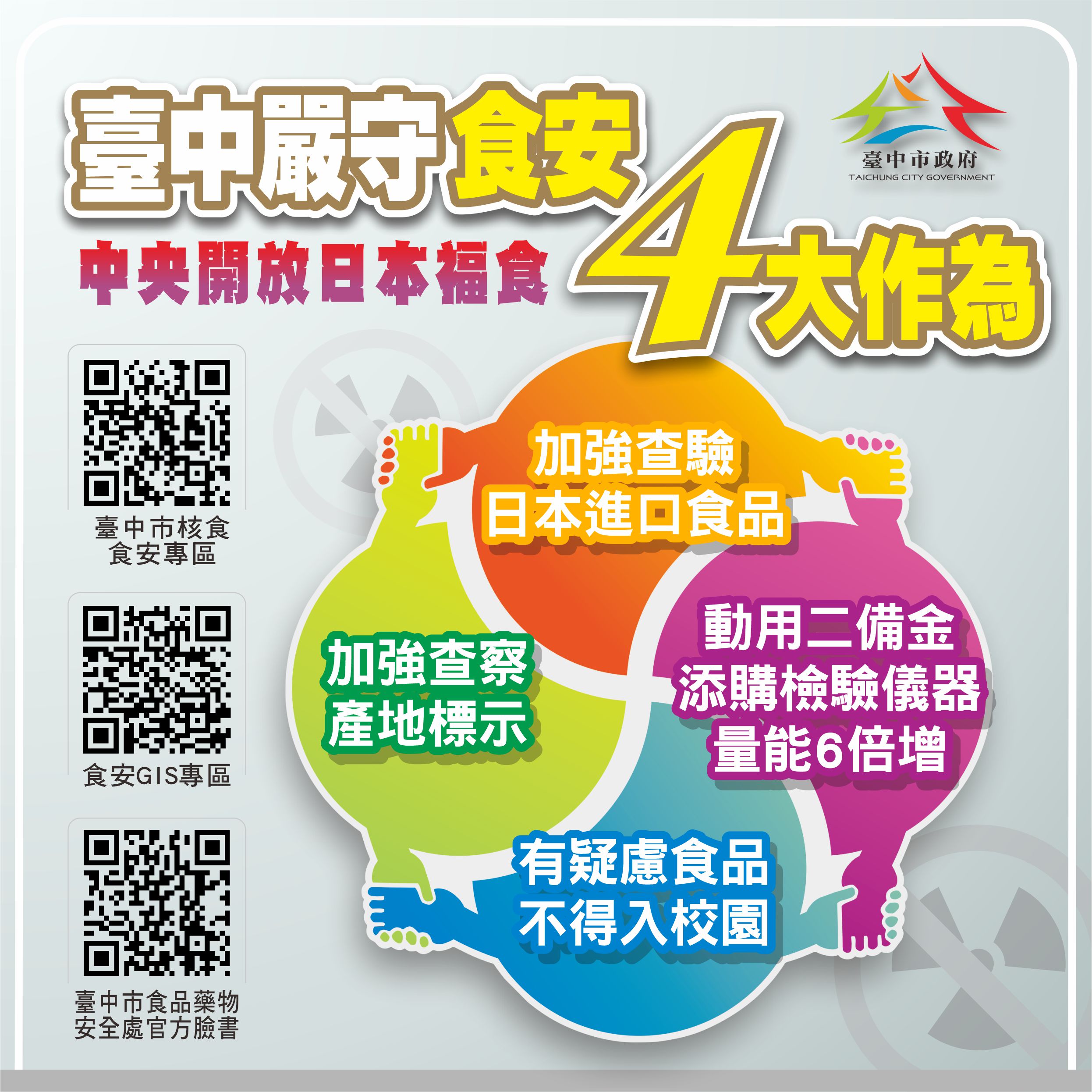 中央即將開放日本福島五縣食品進口,台中市政府祭出四大作為,包含加強查驗日本進口食品、動用二備金添購檢驗儀器量能6倍增、檢驗有疑慮食品不得入校園、加強查察產地標示,為市民把關食安。台中市食品藥物安全處從今年初至今,已查驗日本食品來源及標示348件、抽驗輻射物質40件,均合格,並提供「日本食品聰明選3招安心購」,讓市民買得放心不踩雷。