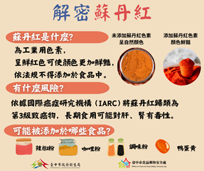 依據國際癌症研究機構(IARC)將蘇丹紅歸類為第3級致癌物,長期食用可能對肝、腎有毒性。