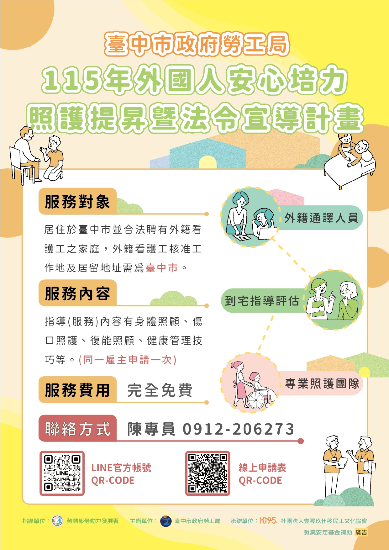 115年外國人安心培力照護提昇計畫DM 為提升外籍看護工照護技巧,本局持續辦理外國人安心培力照護提昇計畫,視個案需求安排居家護理師、照護服務員或物理治療師免費到宅指導外籍看護工基本照護技巧,並由通譯人員協助溝通,反映被照顧者需求及適時提供必要協助,打造安心的照護環境。 本計畫預計服務150個家庭,每1位雇主可申請1次服務,每次服務100分鐘,被照顧者居住地及家庭看護工核准工作地為本市的家庭均可提出申請。