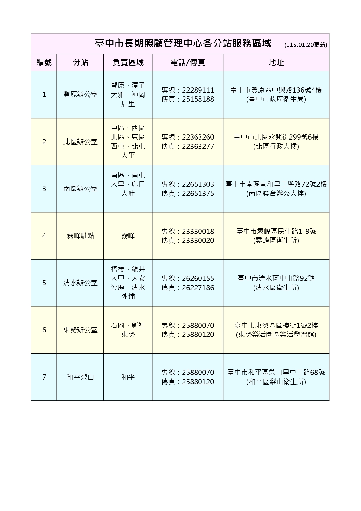 因應高齡化社會,建立優質、平價、普及的長照服務體系,實現在地老化,推動「長期照顧十年計畫2.0」,106年12月25日起中西區辦公室搬遷至北區辦公室(北區行政大樓)服務109年12月10日南區辦公室(南區聯合辦公大樓)正式啟用112年6月19日清水辦公室(清水區衛生所)正式啟用,113年8月1日東勢區辦公室(東勢樂活園區樂活學習館)正式啟用,清冊詳如附圖。