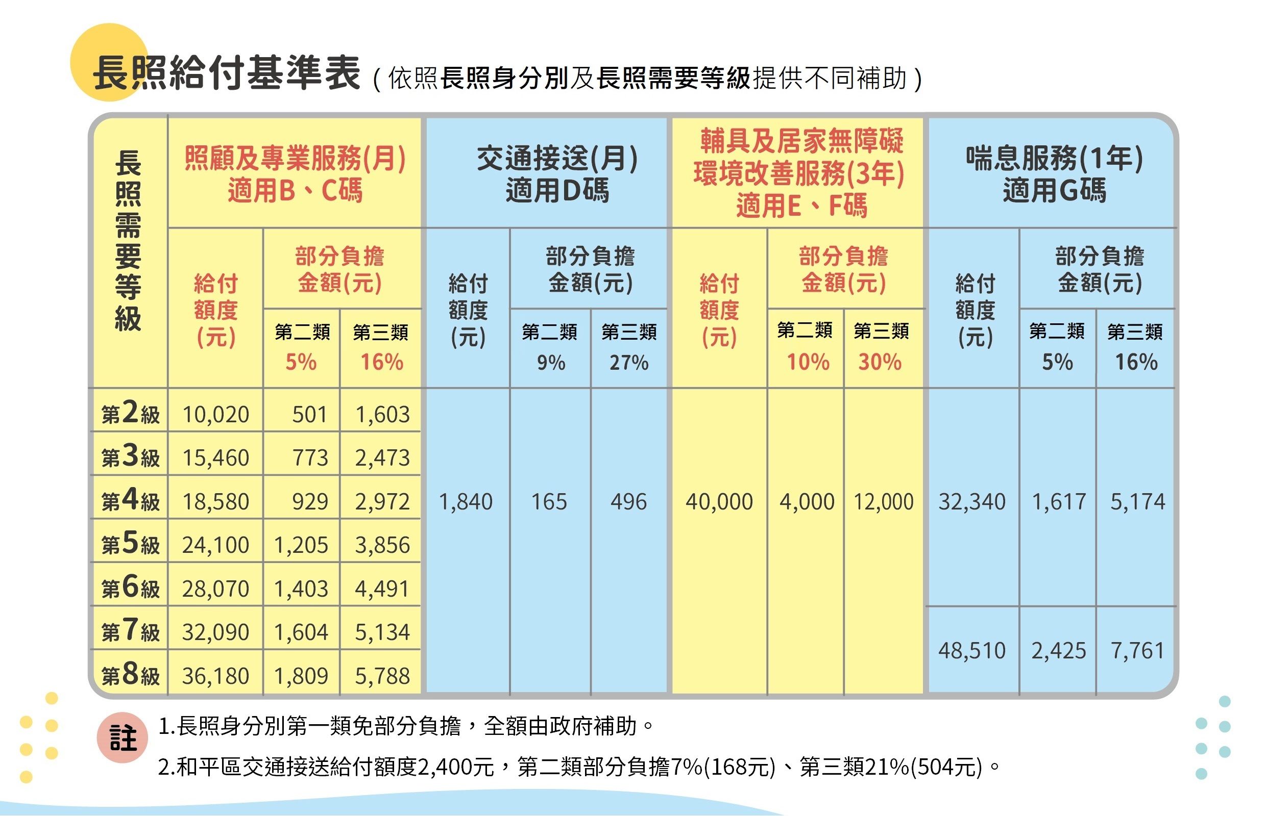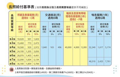 有照顧服務(包含居家服務、日間照顧及家庭托顧)、交通接送、專業服務、輔具及居家無障礙環境改善、喘息服務、營養餐飲服務、長期照顧機構服務、家庭照顧者支持服務、小規模多機能服務、銜接出院準備服務。
