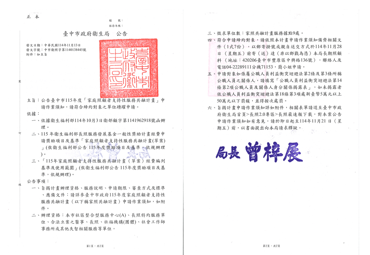 一、依據: (一)依據衛生福利部114年10月3日衛部顧字第1141962918號函辦理。 (二)115年衛生福利部長照服務發展基金一般性獎助計畫經費申 請獎助項目及基準「家庭照顧者支持性服務共融計畫(草案)」(俟衛生福利部公告 115年度獎助項目及基準,依規辦理)。 (三)「115年家庭照顧者支持性服務共融計畫(草案)經費編列基準及使用範圍」(俟衛生福利部公告 115年度獎助項目及基準,依規辦理)。 二、公告事項: (一)旨揭計畫辦理資格、服務說明、申請期限、審查方式及標準、應備文件:請詳參臺中市政府115年度家庭照顧者支持性服務共融計畫(以下稱家照共融計畫)申請作業須知,如附件。 (二)辦理資格:本市社區整合型服務中心(A)、長照特約服務單位、合法立案之醫事、長照、社福機構(團體)、社會工作師事務所或其他失智相關服務等單位。 (三)徵求單位數:家照共融計畫服務據點9處。 (四)符合申請締約對象,請依照本計畫申請作業須知備齊相關文件(1式7份),以郵寄掛號或親自送交方式於114年11月28日(星期五)前寄(送)達(非以郵戳為憑)本局長期照顧科(地址:420206臺中市豐原區中興路136號),聯絡人及電話04-22289111分機71153,簡小姐申請。 (五)申請對象如係屬公職人員利益衝突迴避法第2條及第3條所稱公職人員之關係人,請填寫「公職人員利益衝突迴避法第14條第2項公職人員及關係人身分關係揭露表」,如未揭露者依公職人員利益衝突迴避法第18條第3項處新臺幣5萬元以上50萬元以下罰鍰,並得按次處罰。 (六)旨揭計畫申請作業須知詳如附件,相關表單請逕至臺中市政府衛生局首頁>長照2.0專區>長照最速報下載,對本案公告申請作業須知如有意見,請於即日起至114年11月21日(星期五)前,以書面提出向本局請求釋疑。 |