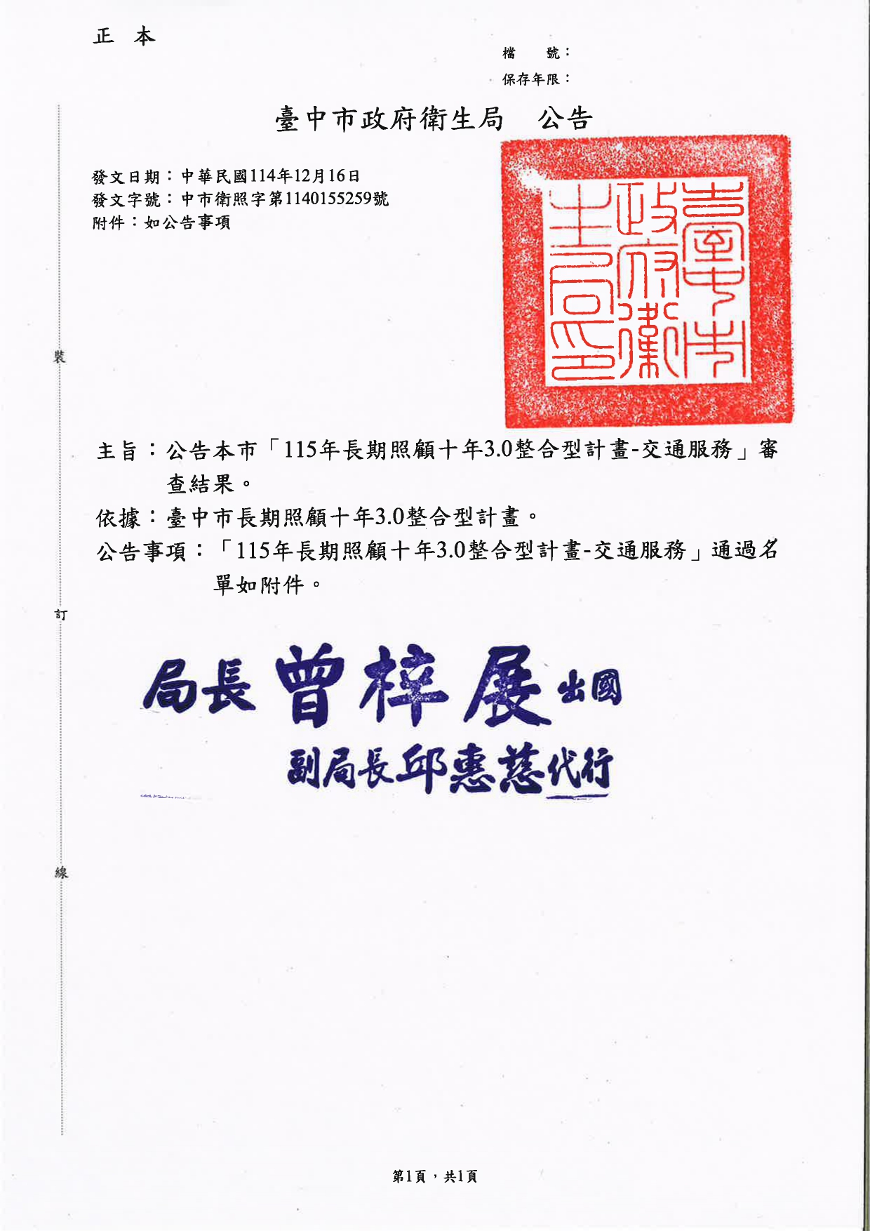 公告事項:「115年長期照顧十年3.0整合型計畫-交通服務」審查通過名單如附件。