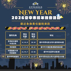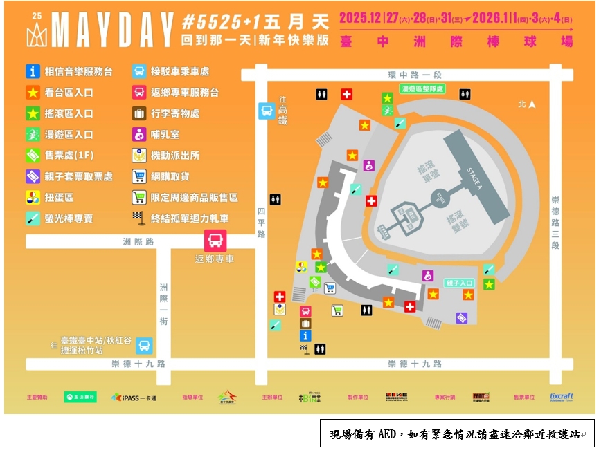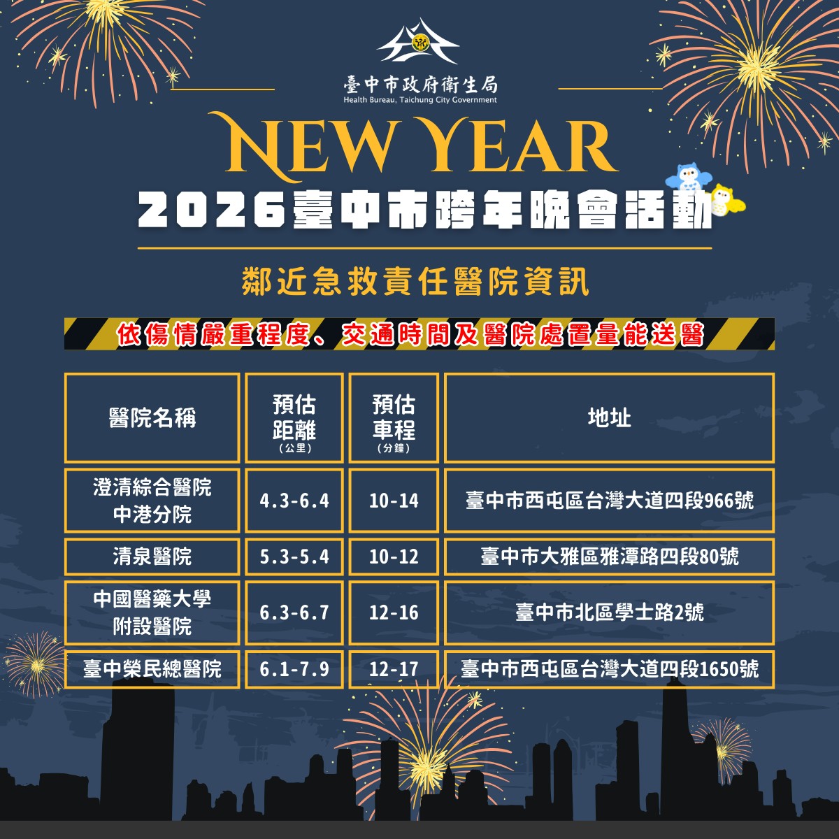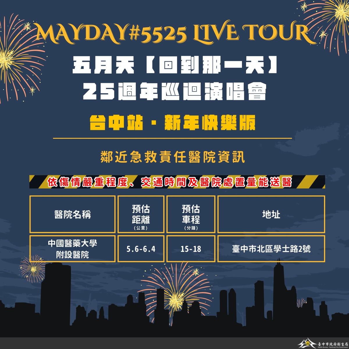隨著新年將至,「台中Hi8 全城開趴」系列活動接力登場,包括五月天一連6天的演唱會及跨年晚會。 為守護市民安全、營造安全場域,本府實施「四大安全方案」,結合細胞簡訊機制、完善監視系統、清楚規劃疏散動線與設備配置,確保活動安全無虞。 五月天演唱會及跨年晚會現場皆設有救護站並安排救護車待命,及時因應各種突發狀況,守護活動參與民眾安全。