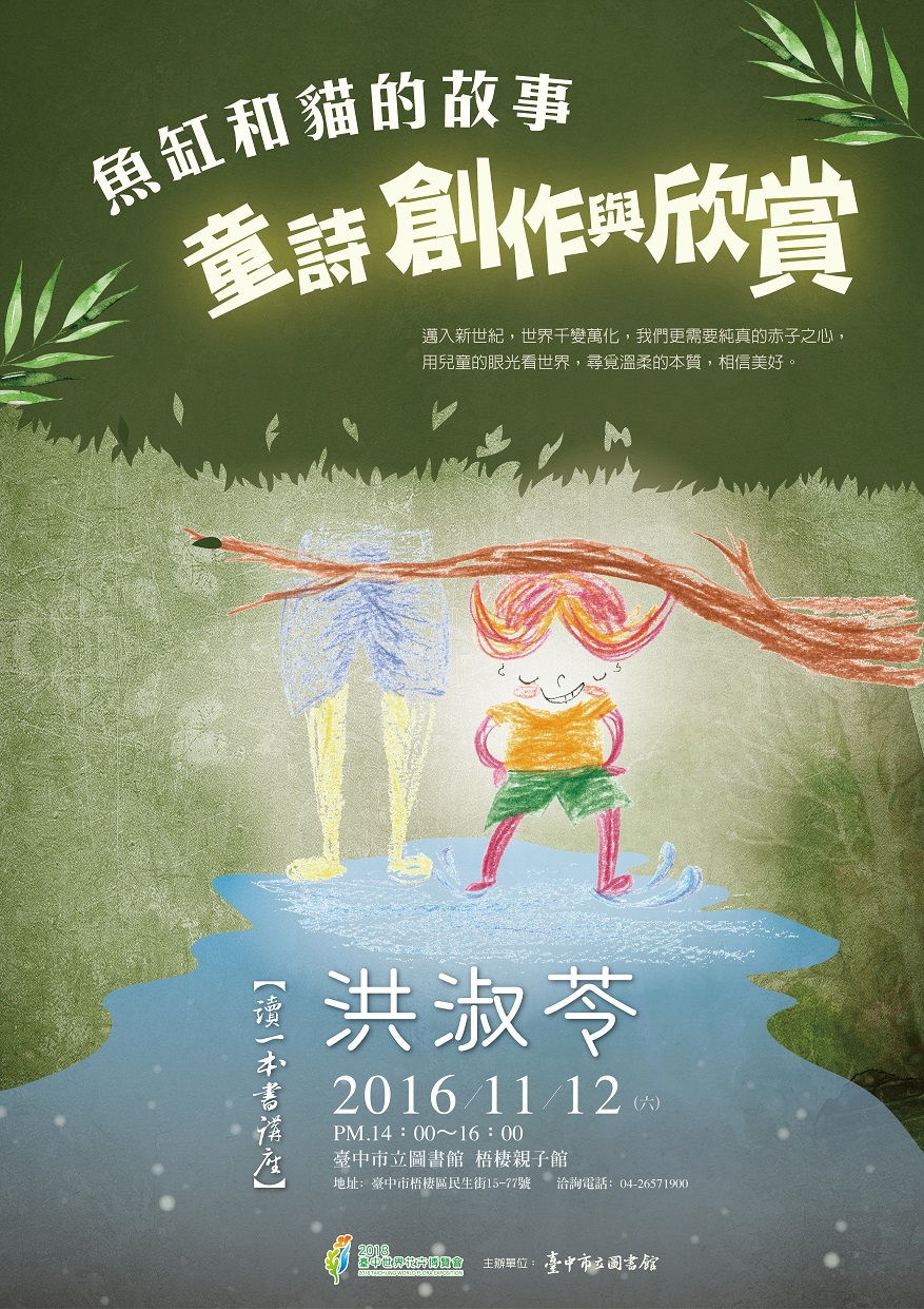 二、旨揭講座邀請台大中文系洪淑苓教授分享「魚缸和貓的故事--談童詩創作與欣賞」,帶領民眾透過日常生活題材,加上想像力及幽默感,寫出一首首可愛的童詩。